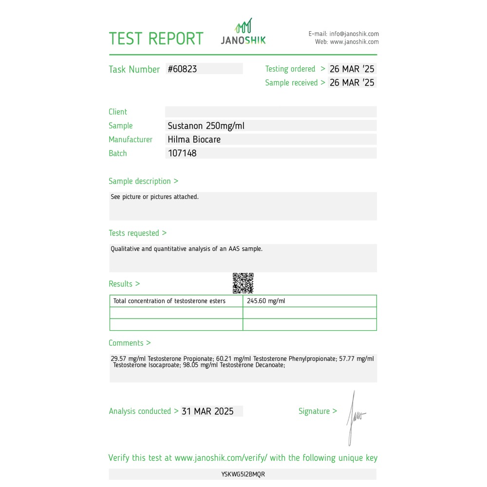 Info: Sustanon est un mélange de testostérone injectable à base d'huile, développé par Organon. Ce produit contient quatre esters différents, conçus pour provoquer une libération rapide de testostérone des esters de propionate et de phénylpropionate, combinée à une libération plus lente des esters de décanoate et d'isocaproate. Le mélange de testostérone est composé de: 30 mg de propionate de testostérone, 60 mg de phénylpropionate de testostérone, 60 mg d'isocaproate de testostérone et 100 mg de décanoate de testostérone.